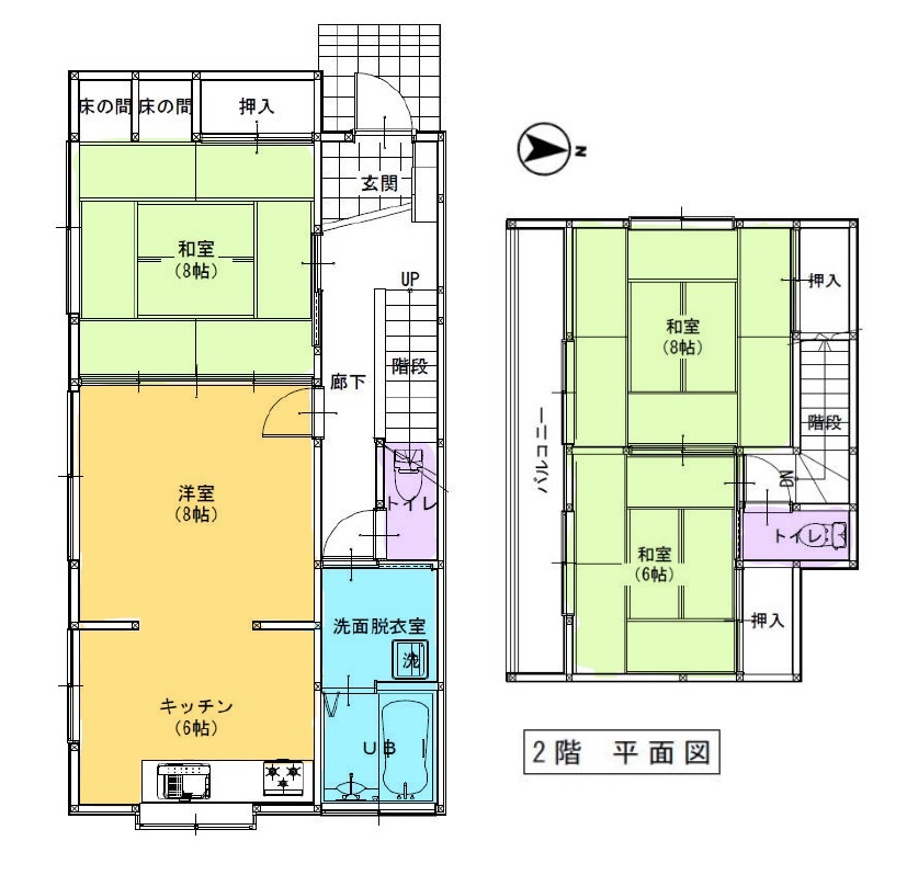 間取内訳 4DK 1階 K6帖 洋室8帖 和室8帖 2階 和室6帖 和室8帖