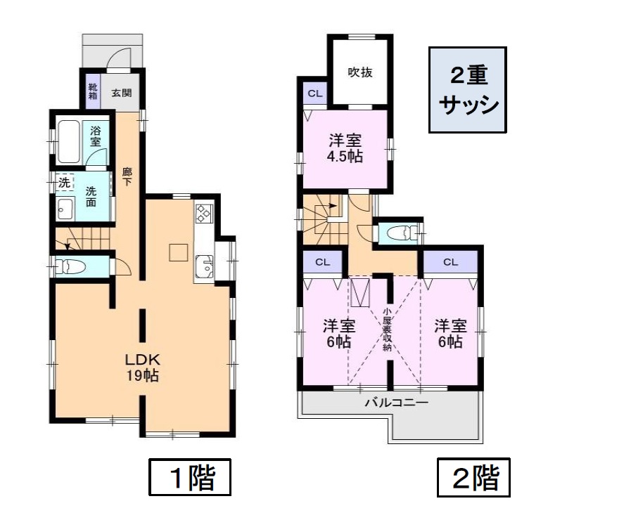 間取内訳 1階 LDk19帖  2階 洋室6.0帖 洋室6.0帖 洋室4.5帖
