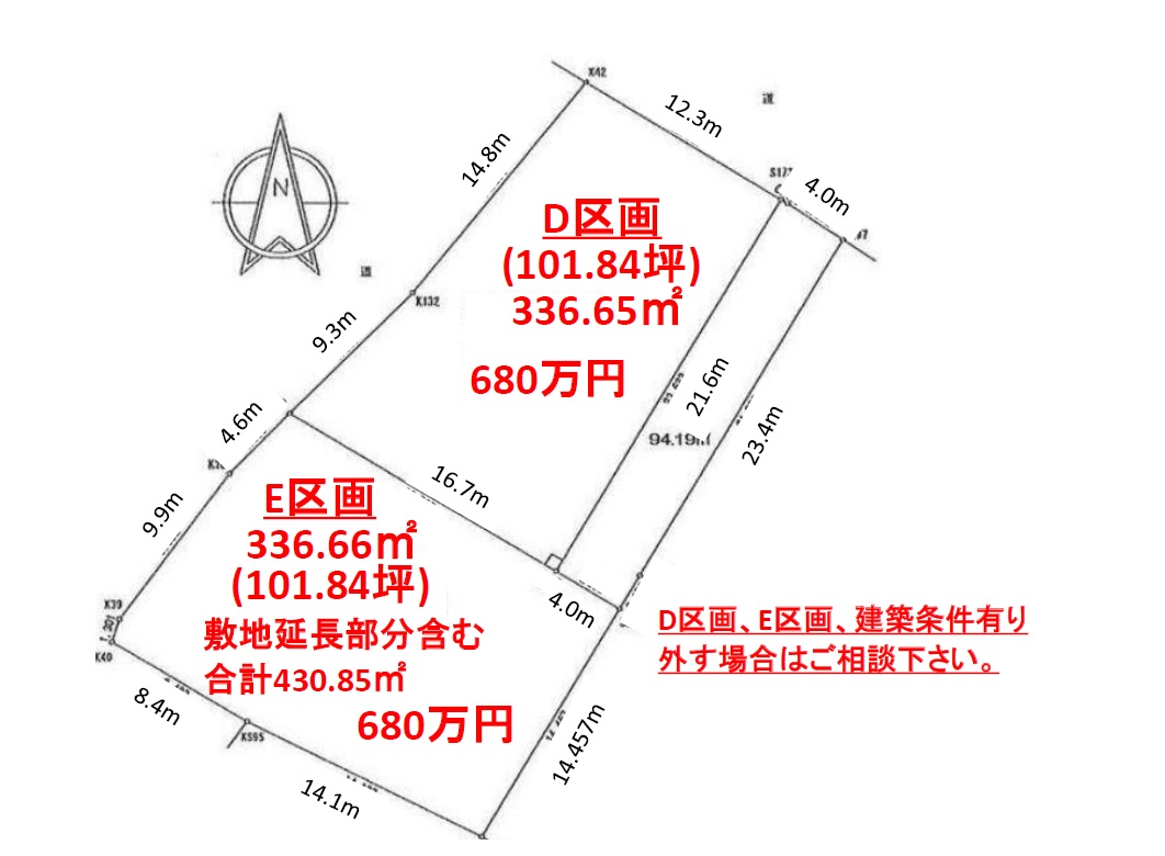 ⼟地⾯積 | E区画430.85㎡ D区画336.65㎡ | 私道⾯積 (共有持分) |