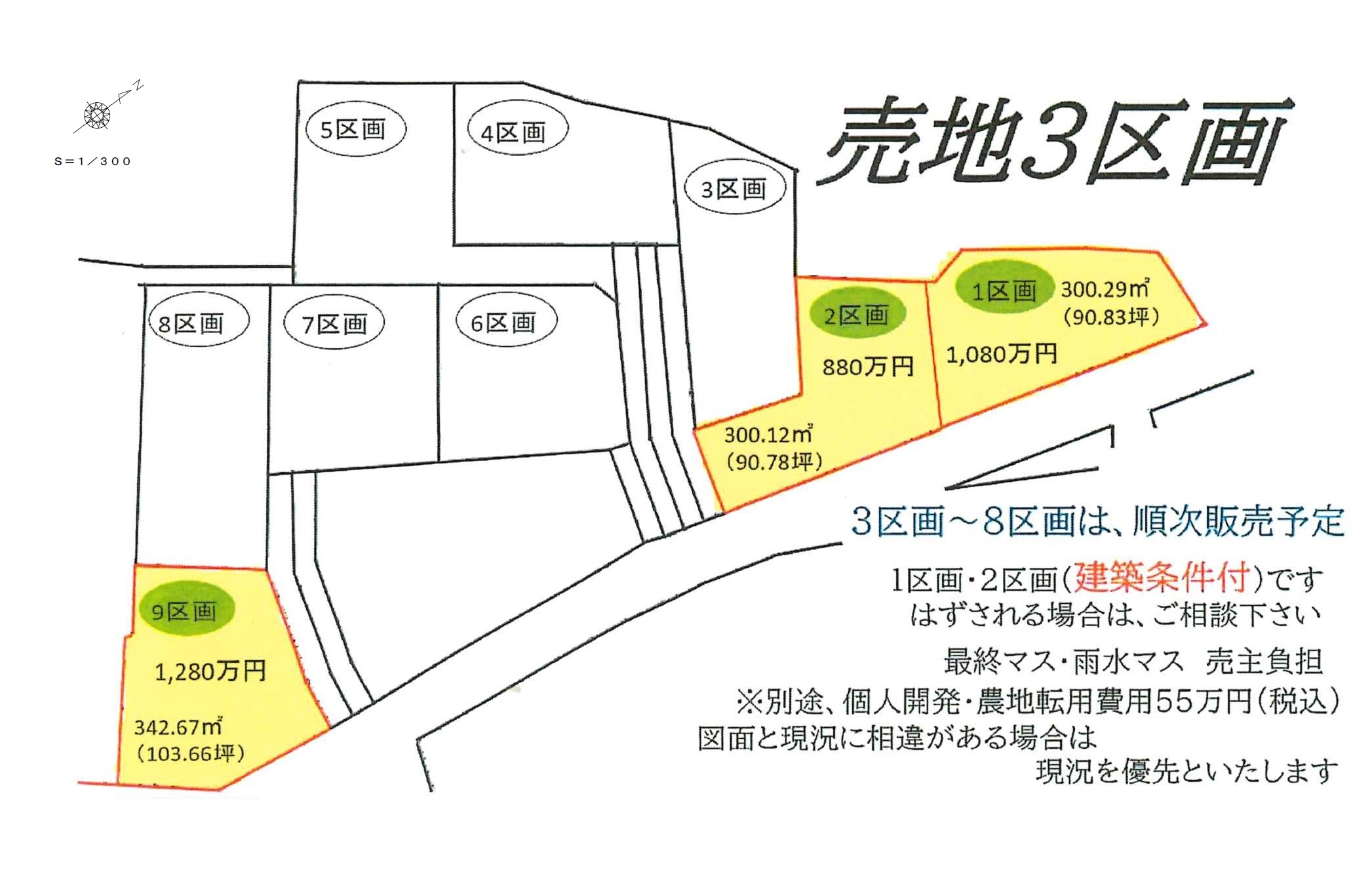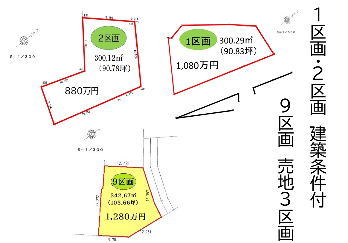 | ⼟地⾯積 | 1区画300.29㎡ 2区画300.12㎡ 9区画342.67㎡ | 私道⾯積 (共有持分) |
