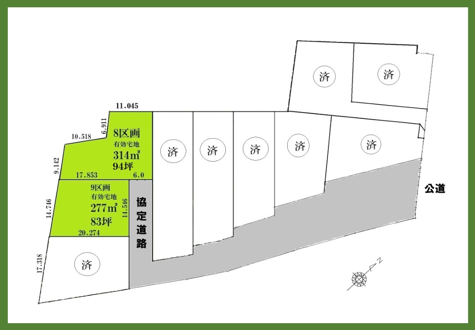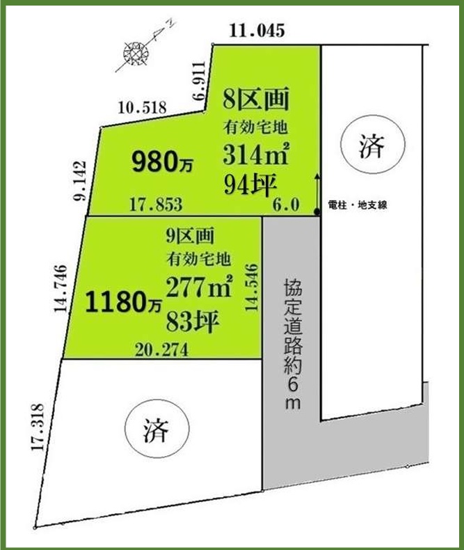 | 備考 | ※最終マス・雨水マス売主負担。別途開費用。55万(税込)上水道接続費用55万(税込)。 ※8区画には電柱及び地支線が入る予定です。 | ||